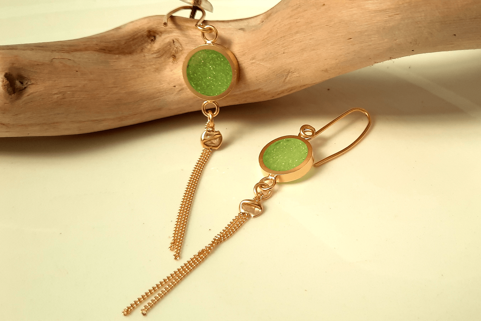 איזו הפתעה יש הפעם בתוך האקריל? נצנצים ירוקים! עבודת שכבות ביצירה עדינה של העגילים יוצרת כל פעם מראה חדש ואחר ובנוסף תלויה לה שרשרת ומוסיפה תנועה ויופי לעגיל.